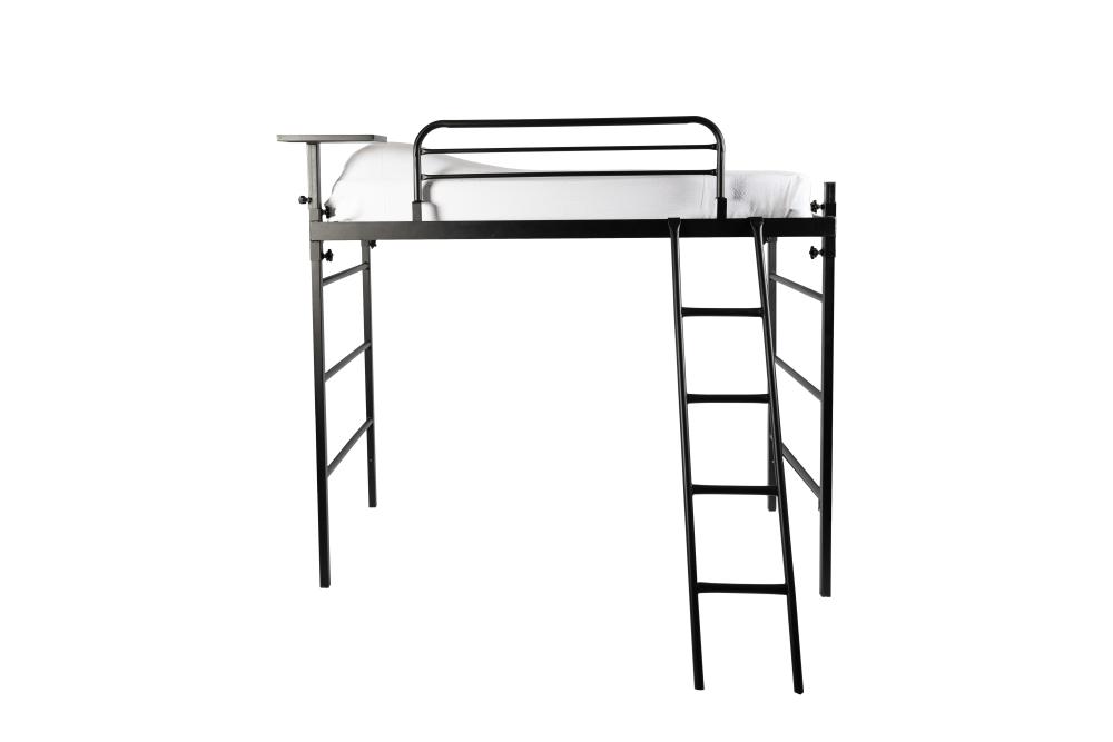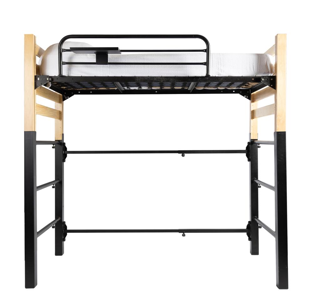 Our loft kit has become the most popular option with the current bed frames in most residence halls. They are designed to loft a complete wooden or metal bed without having to disassemble it. These loft kits are patented to expand in length and width and are designed to work with all sizes of residence hall beds that have a headboard and footboard. The kit itself is available in two standard heights, tall and short. We work with you to determine which height will work best for your rooms on campus. Factors we consider when determining which to use are whether the bed frame you currently have is adjustable in height, as well as what the ceiling height of the room is. We include our securely attaching safety rail with every order. Each of our kits also have ladder and shelf options available. Pair that with no tools being needed for assembly and you have a true crowd pleaser with this loft kit! Just take a few minutes to watch the easy instructional video, and you will be set!